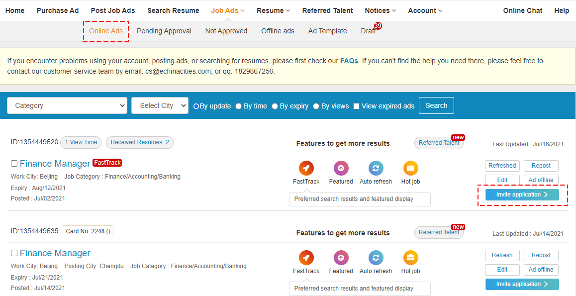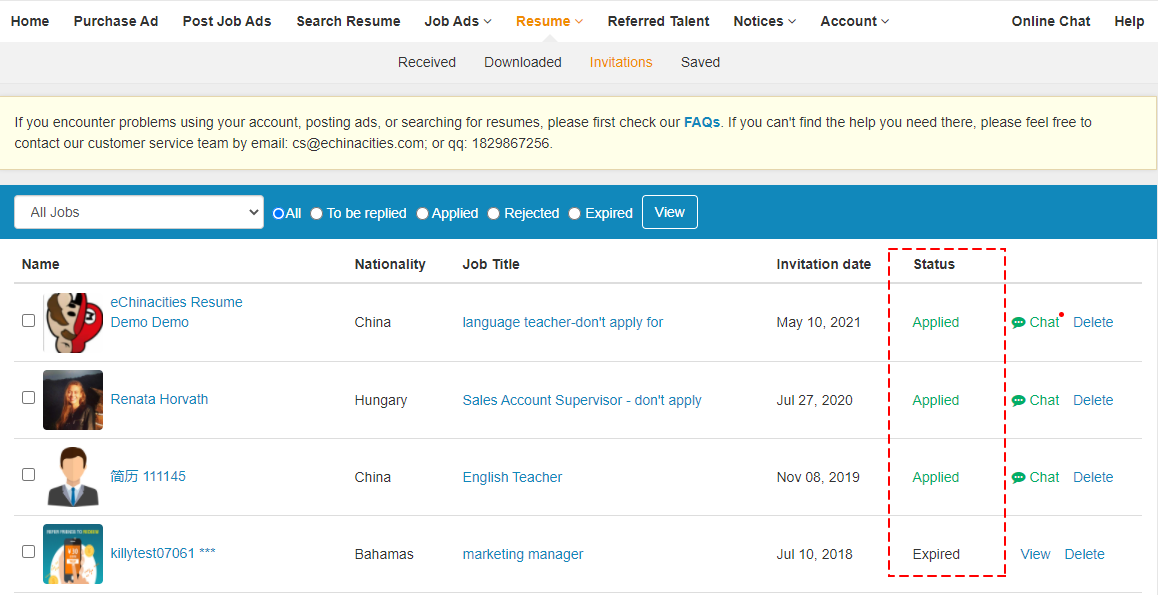 The eChinacities messaging system will deliver your invitation to the selected candidates by email, system message, wechat message etc. and send you the feedback in same method. Recruiters can then communicate with those candidates who have accepted the invitation for further discussion.